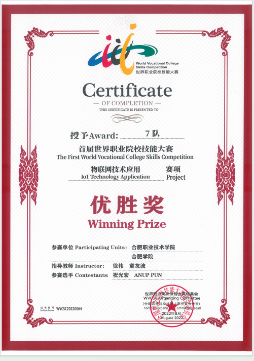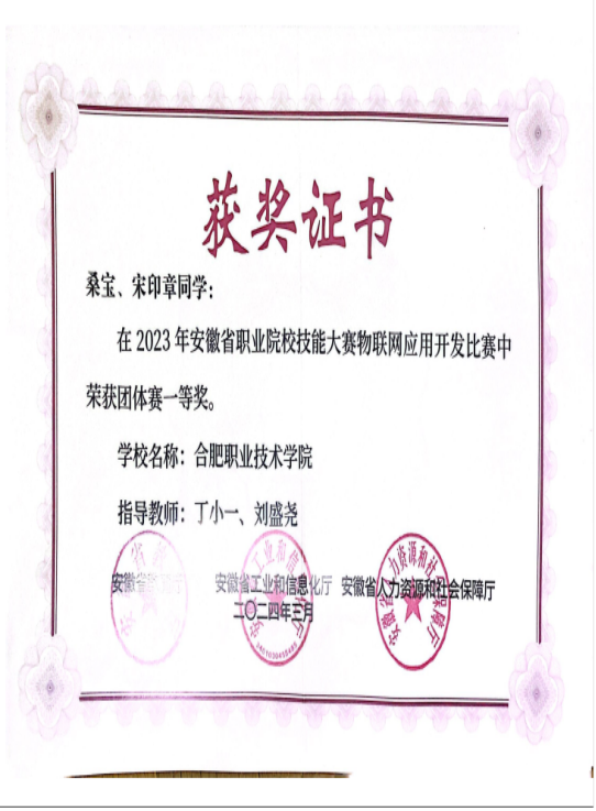 【专业建设成果】2019年7月,经教育部认定,获批国家级的物联网“双师型”教师培训基地。自2015年至今连续9年(2020年疫情中断一次)参加全国职业院校物联网应用开发赛项,获得一等奖一次、二等奖四次、三等奖三次,2022年参加首届世界职业院校技能大赛物联网应用技术赛项获优胜奖,并多次参加安徽省单片机及嵌入式比赛、全国大学生智能汽车竞赛安徽省物联网创新赛等,均取得良好成绩。