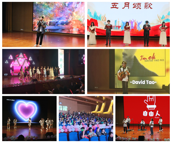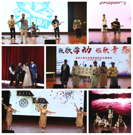 晚会开始,在悠扬的校园民谣乐曲中,舞台大幕播放的校园老照片视频把观众带回了美好的校园时光,接下来,希望星期八乐队带来的吉他弹唱又使人联想紧张学习后的休息日惬意。接踵而至的模特走秀、古风舞蹈、吉他弹唱、茶艺表演等节目在劳动与青春的主题中不停切换。回望尽头留下青葱岁月,展望前方不尽似水流年,一首吉他弹唱《找自己》勾起了大家对大学生活的无尽回忆。晚会中场穿插的“听音乐猜歌名”互动小游戏,也将晚会推向一个高潮。飞琼炫舞社的爵士舞蹈串烧、乐队演唱《阳光宅男》、歌曲《再见深海》等节目更是让观众叹为观止。演员们在欢快的节奏、跳跃的音符中展现出现代大学生的青春与活力,赢得场下观众一阵阵的喝彩。最后,晚会在主题朗诵《五月颂歌》中落下帷幕。