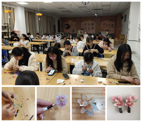 制作中,同学们沉醉于珠翠钗环中的传统手工艺术制作的过程之中。提高了自己的动手能力,缓解了日常学习的压力;展现出自我创造力的同时,也为大学生的校园生活增添些许“艺术味道”。