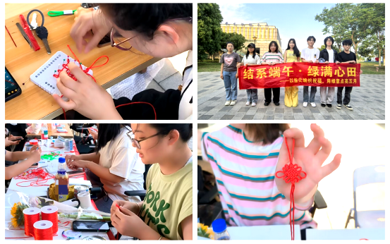 作为传统饰物,万字结承载着“吉祥万德、绵延长久”的美好寓意。志愿者们化身文化使者,细致讲解万字结的悠久历史与深刻内涵。五彩丝线在同学们手中穿梭缠绕,从生涩到流畅,一个个寓意深远的万字结逐渐成形。“以前只知端午吃粽子,今天亲手编结,才真正触摸到这份穿越千年的祝福,绳结里藏着古人的智慧与期盼。”一位初次尝试的同学兴奋地展示着自己的作品。完成万字结的同学,都收到了一份特殊的“回礼”——内含各类植物种子的环保盆栽。