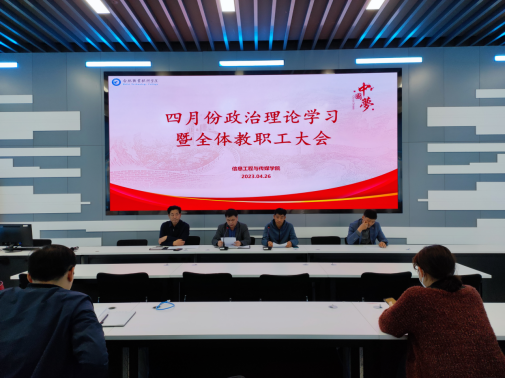 4月26日,金年会jinnianhuicom召开全体教职工大会暨四月份政治理论学习,进一步改进学院作风建设,提高教学水平和科研能力,着力营造争先创优的良好发展环境,会议由学院内党总支副书记(主持工作)尹仕果主持,全体教职工参加会议。