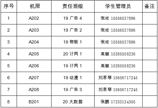 本学期信传学院共使用机房、实验室25个,使用班级共39个。多数机房、实验室授课任务重,授课班级多,为了让老师和学生拥有一个良好的实习环境,也为了授课老师能及时对机房软件进行更新和安装,将机房、实验室学生管理员的联系方式附表。并安排班级在授课场所进行卫生打扫,希望授课老师能通力合作。