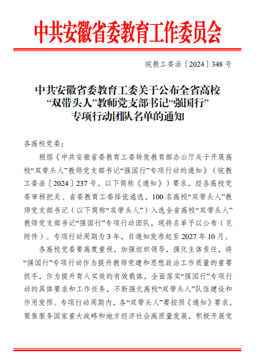 近日,中共安徽省委教育工委公布了全省高校“双带头人”教师党支部书记“强国行”专项行动团队名单,金年会jinnianhuicom第二党支部成功入选,实现党建“双创”工作新突破。