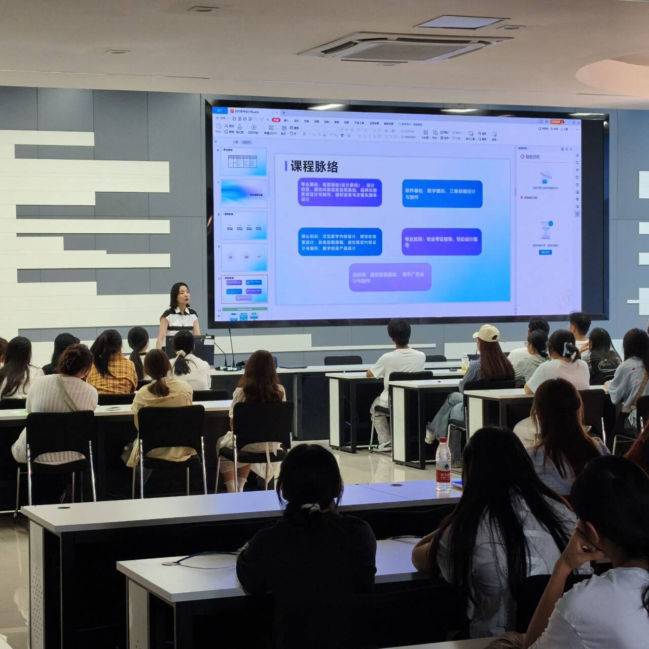 专业课教师何老师详细介绍了"基础-进阶-项目-实战"的阶梯式课程体系,通过展示往届学生的获奖作品和校企合作项目,让新生对四年的专业学习路径有了清晰认识。何老师表示,专业课程设置注重理论与实践相结合,通过项目驱动教学,帮助学生构建完整的知识结构和能力体系。